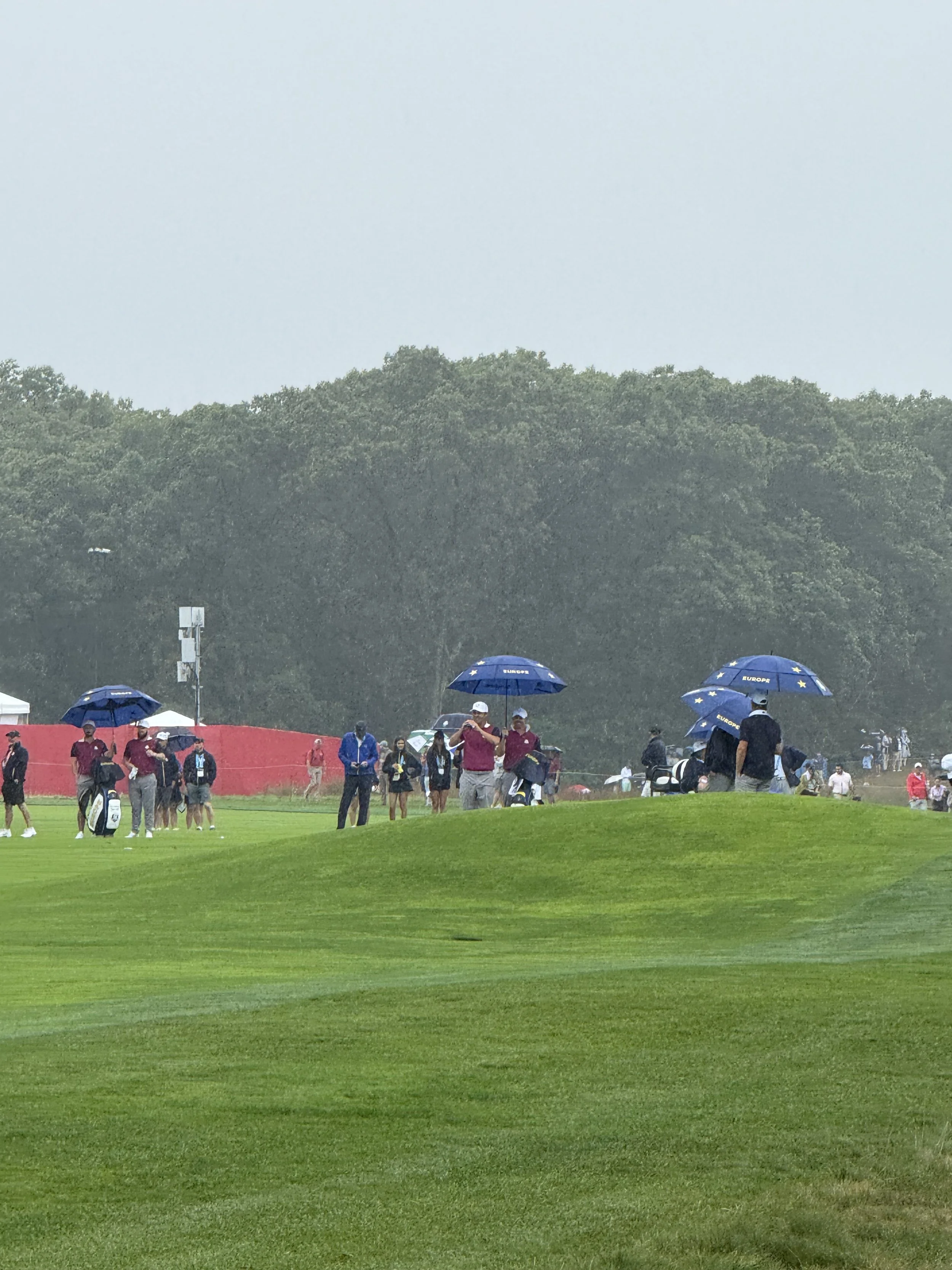 The grandstand on 1 was incredible — you could see both the opening tee shot and 18th green, creating a true stadium vibe. We walked the front nine in a steady drizzle, clocking close to ten miles for the day. Team Europe was out playing, while Team USA rested. A bit of a bummer, but we’d see them Friday.